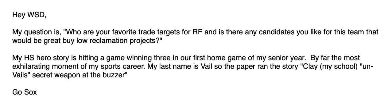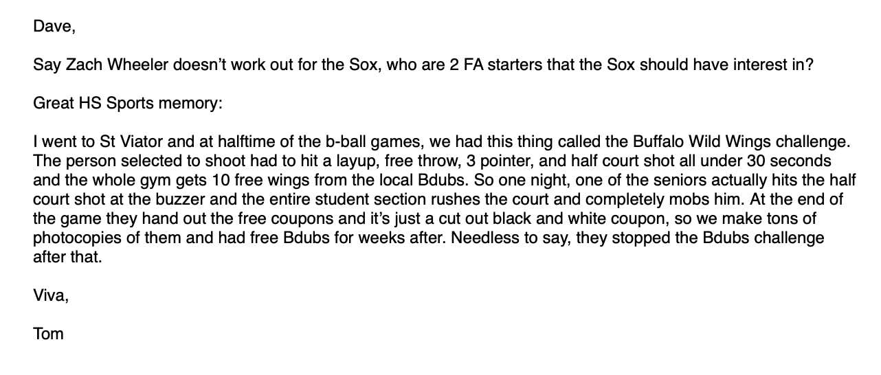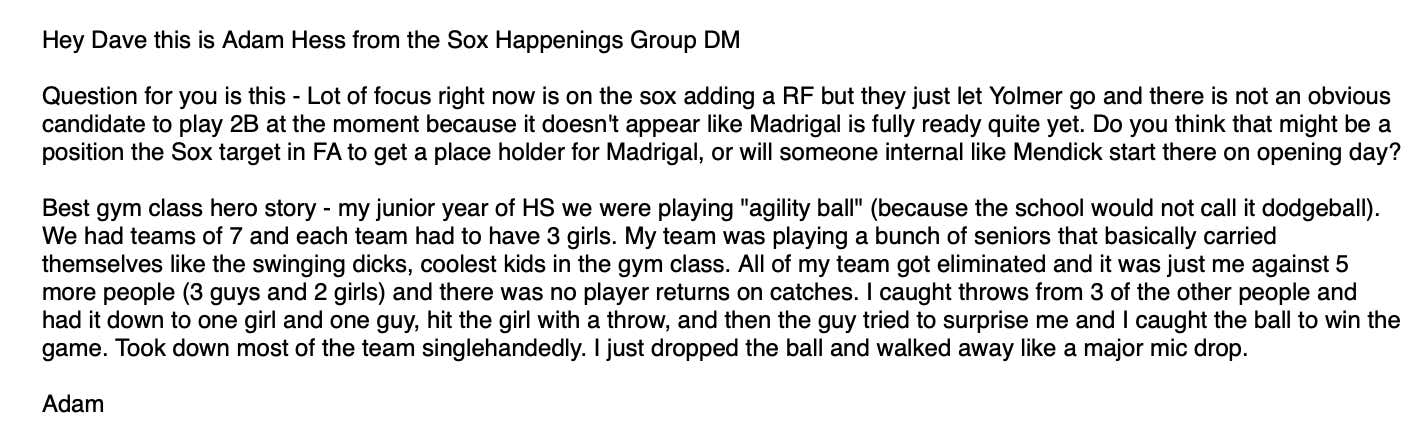 Last weekend was the IHSA state playoffs and as always, and as is tradition, it’s a weekend long dick measuring contest for 30+ year old, washed up has beens like myself and Carl to tout our HS greatness. Because of that, I figured I’d do a little White Sox mailbag/ glory days/ gym class hero mailbag: