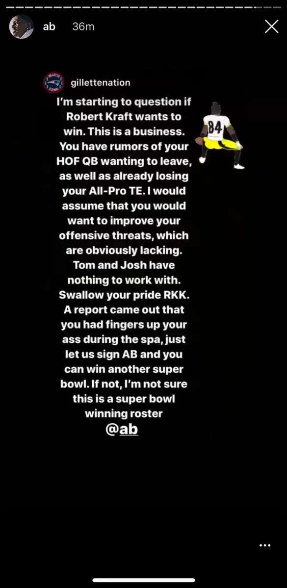 So with that, lets end any and all discussion about Brown coming back to the Patriots, no matter how frustrated Brady seems or how much the other receivers struggle. The first qualification for a job is not talking about things going up inside your boss’ things, no matter what field you’re in, from bagging groceries after school to catching touchdown passes. Everybody knows that. Except, apparently, Antonio Brown, whose stupidity on social media knows no limits. Now stop talking about bringing him back. I mean it this time.