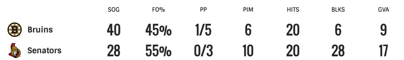 - Once again the bounces on offense just aren't coming. Even with 40 SOG the B's passed up some great chances to shoot the puck. Frustrating.