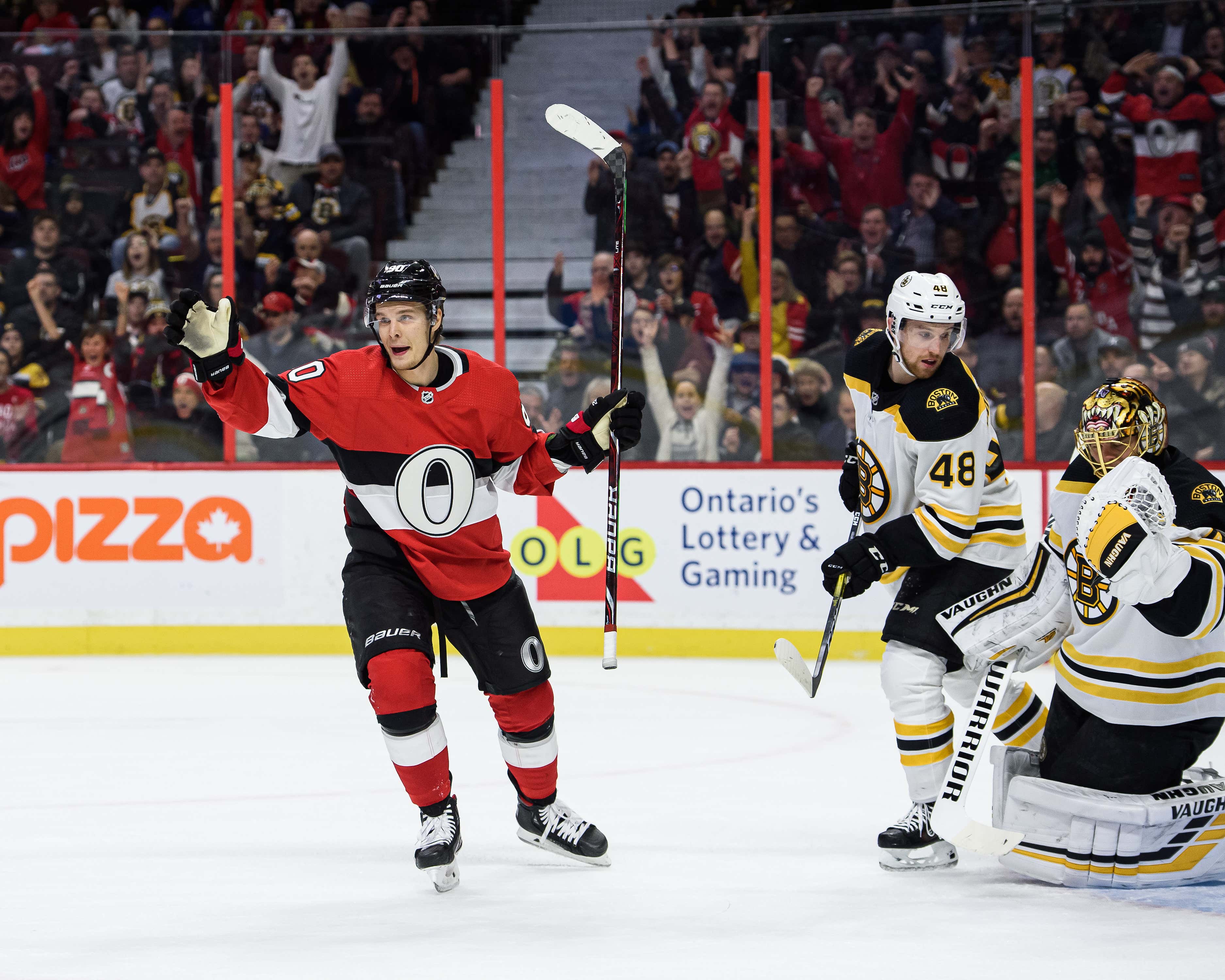 Chris Tierney made it 3-1 Ottawa early in the 2nd. Tuukka Rask came out to play the puck behind the net and just didn't attempt to get back in net. His controlled really disconnected. 3-1 Senators after 2.