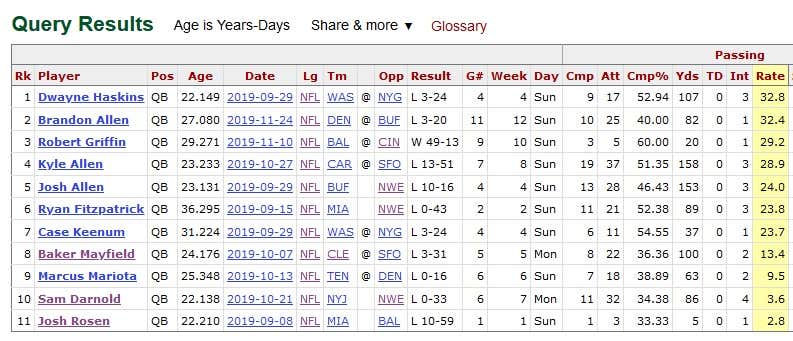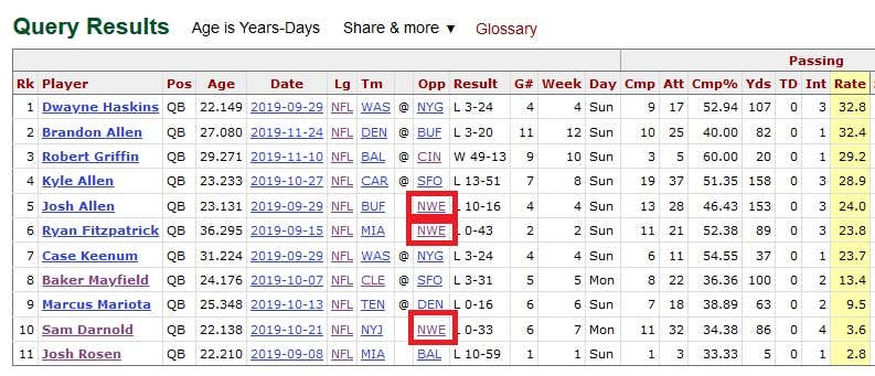 In other words, these two have held all their opponents combined to numbers below the worst starting QBs in football playing their worst games. So it should follow logically that three of the seven worst passing performances of the year came against New England (Recycling the same graphic because visual learning is important when teaching Millennials.):