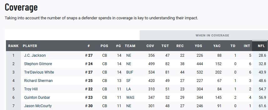 No NFL team in the PFF-era (2006 and beyond) has ever had cornerbacks in those two top spots. No cornerback has ever allowed a passer rating lower than 31.1 (Casey Hayward, 2012) in a full season. Only four cornerbacks since 2006 have allowed a passer rating lower than Gilmore’s 32.8 metric. …