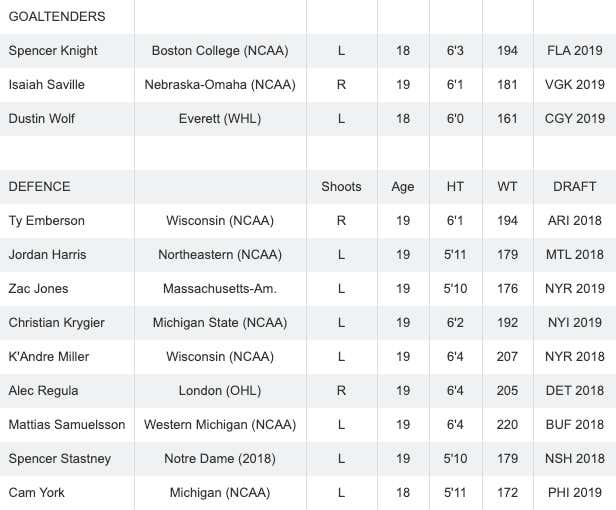 I mentioned Alexis Lafreniere (2020 Draft), Quinton Byfield (2020 Draft) and Barrett Hayton (ARI '18) in my Top 10 Players To Watch list so we don't need to talk about them anymore here. But…I mean…how can you talk about this roster and not talk about Lafreniere? He's been pegged as the next great so let's look at some greats of the past. Sidney Crosby put up 6 goals and 3 assists in 6 games at the WJC during his draft year and they won gold. Alex Ovechkin put up 5 goals and 2 assists in 6 games at the WJC during his draft year, and also got to put up 7 goals and 4 assists the next year thanks to the lockout. He won gold in 2003. McDavid put up 3 goals and 7 assists in 7 games at the WJC during his draft year. He won gold in 2015. And Matthews put up 7 goals and 4 assists in 7 games at the WJC during his draft year. They won bronze that year.