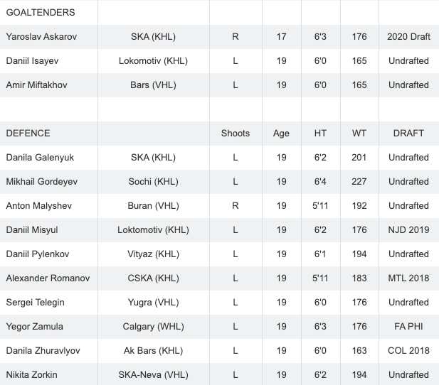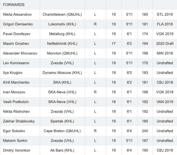 I'll be totally honest here. I don't know a TON about the Russian team. That's because most of these guys play in the KHL and haven't been drafted. On the entire team, 11 of these guys have been drafted by an NHL team. That'll change to 12 for sure when Yaroslav Askarov (2020 Draft) gets picked up in June, and Maxim Groshev is also a 2020 Draft prospect. But for the most part, we don't hear about most of these guys. But out of the 7 players who are returning from last year's bronze medal team, the one that stands out the most is Grigori Denisenko (FLA '18).