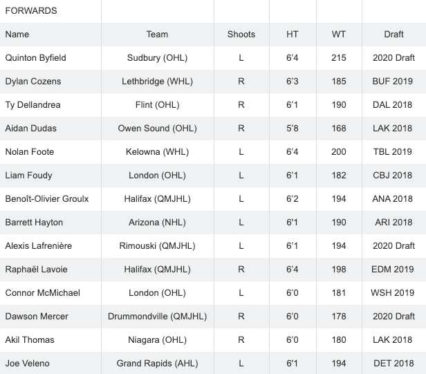 This year Team Canada has 5 players returning from last year's roster. Barrett Hayton, Alexis Lafreniere, Ty Smith, Joe Veleno and Jared McIsaac. Unfortunately for them, they probably have the most pressure on them heading into this year's tournament after they finished 6th last year. They also lost a ton of studs from last year's roster, and will come into this tournament with 5 players in the 2020 Draft class. 2 of those guys could potentially be the top 2 names picked in June but still. The roster just doesn't punch you in the face the way a Team Canada WJC roster typically does. Let's look at the forwards though, because there's a ton of talent there.