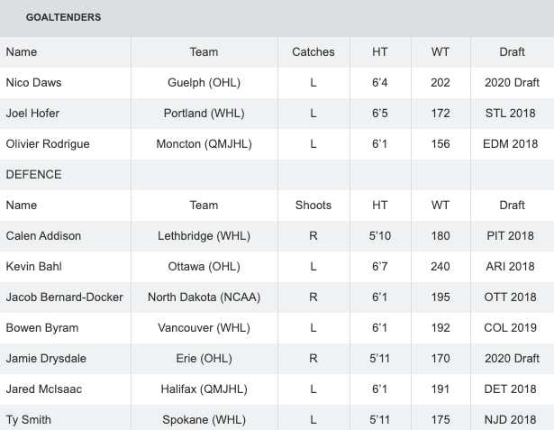 I'm not sure where Nico Daws (2020 Draft) is projected to go in June but what I do know is that he currently leads the OHL in both GAA and Sv% with a 2.06 and .939 respectively. He also won an OHL Championship last year with Guelph. Also, Joel Hofer (STL '18) is 2nd in the WHL (behind USA's Dustin Wolf) in Sv%, and leads the WHL in GAA with 1.81. He also won a WHL Championship in 2018. So Canada is pretty set between the pipes this year.