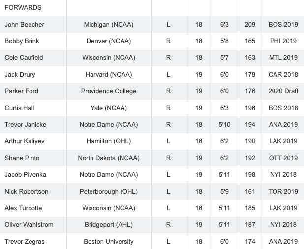 Another player to watch out for on Team USA is John Beecher (BOS '19). Beecher had a big summer which upped his value and now it looks like the B's got a steal with him still hanging around at pick #30. He hasn't done a ton so far this season at Michigan but 5 goals and 4 assists in 16 games isn't bad as a freshman. I think he'll end up being a real solid intangibles guy for this team. Oh, and Bobby Brink (PHI '19) just has a fuckin' sweet name to say.