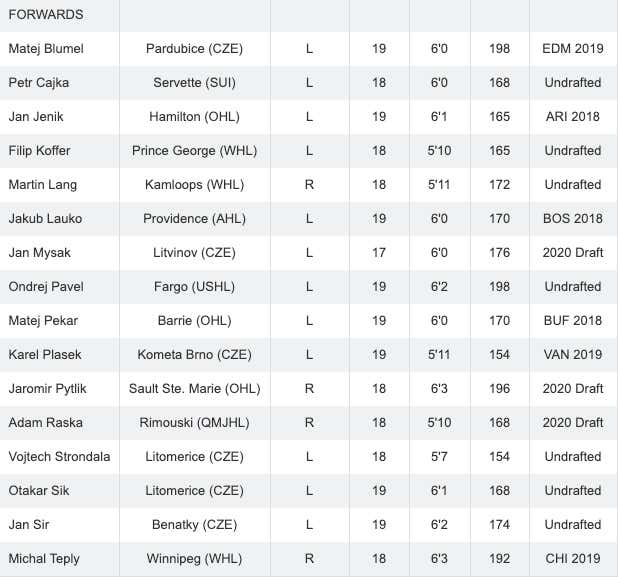 There's also Jakub Lauko (BOS '18). This will be his 3rd World Juniors. He's currently playing with Providence in the AHL and spent last season in North America playing in the QMJHL. They actually have a decent amount of guys on the roster who are playing CHL this year so that'll help them against teams like USA and Canada. But not many names that stand out.