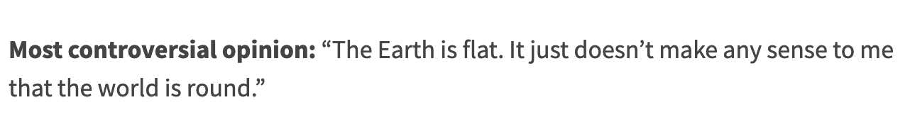 I disagree with Watts, because his most interesting fact isn't that he can cook, but instead that he thinks the world if flat: