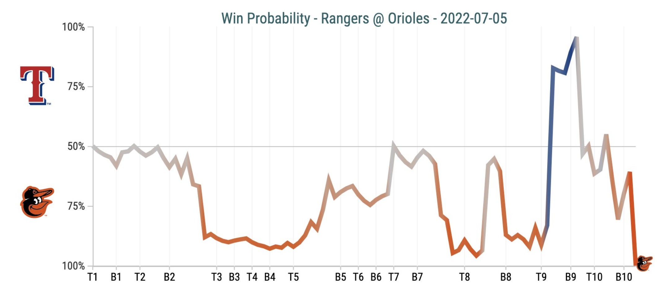 An all around wild win probability chart, O's had it on cruise control for a while and then you could see when the bullpen coughed it up, Only took a little MLB history making to complete this win, first time ever someone has done what they did tonight. This team is fun.