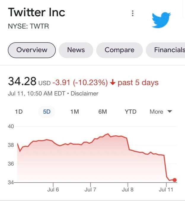… is that it has a proven track record of getting the story you want to hide less engagement. Which is sort of the point. But when said news involves a publicly traded company, there will always be consequences once the weekend is over. In two days or three, the domestic markets will open up again, and we'll all get to see whether the shitstorm you've recreated just blows over or is a Category 5. So far it would appear that Elon Musk's decision to walk away from the counter at Twitter and leave empty handed has caused the company a financial weather event out of a Roland Emmerich film.