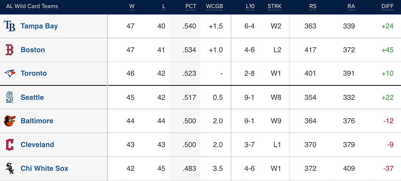 The AL East is a fucking war. Every team is .500 or better and in the playoff hunt. I understand the talent on that roster is way better than 46-42, but when you play every team in that division 19 times a year you're gonna get beat up. Four of the top five wild card teams are from the fucking East.