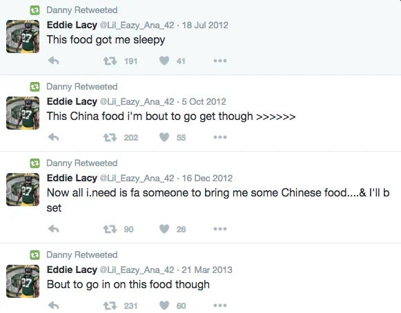 But in Eddie Lacy's defense, he never hid the fact he loved food. If you wanted him on your team, you budgeted for Panda Express as well.