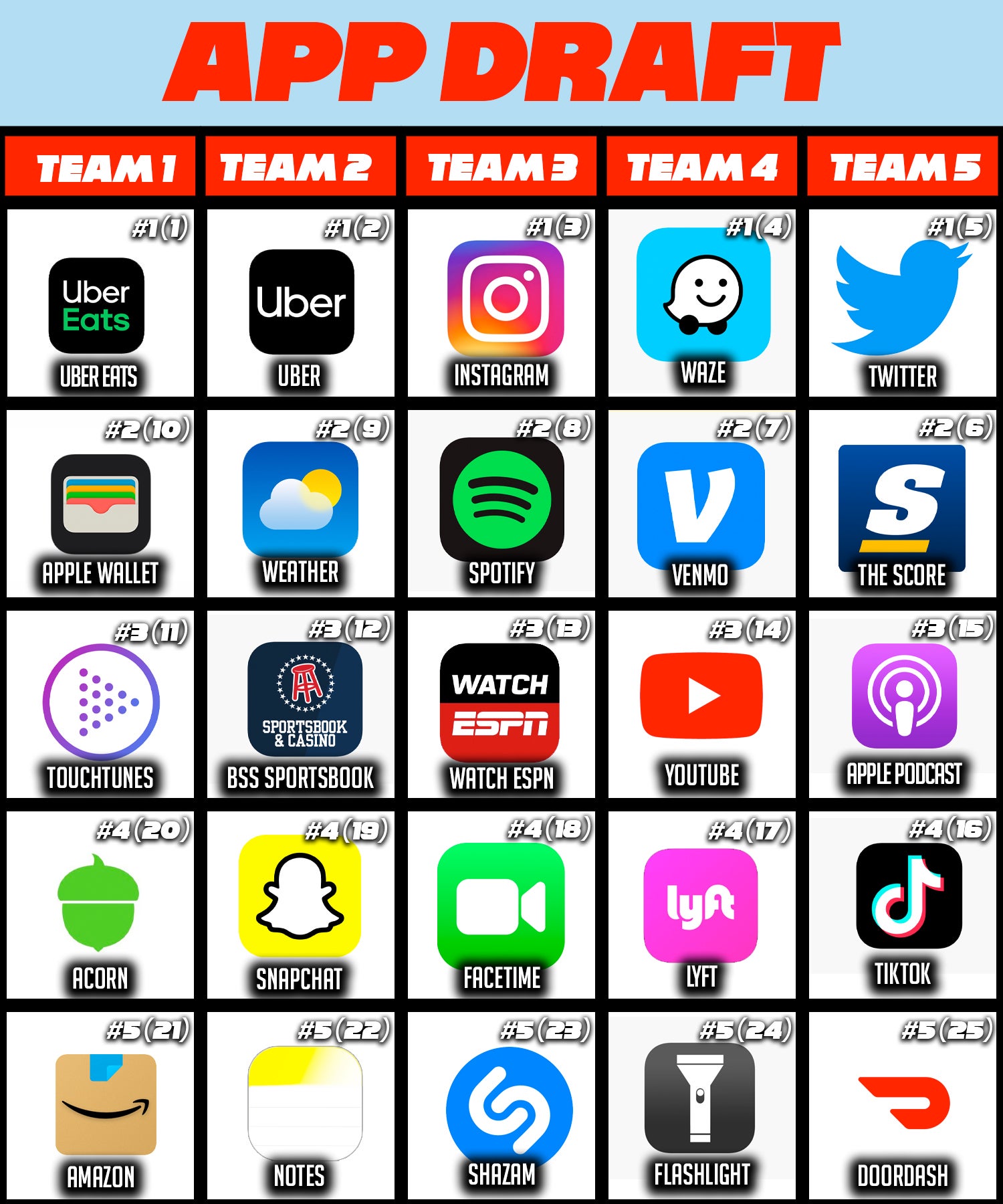 Going Uber #2 overall with Uber Eats going #1 is a power move. Just torpedoed Team #1's draft and also a great pick. Loved the discussion about enabling a new way to go out with your buddies. Weather app is a great pick, but as a Weather app user myself, I know the AccuWeather app my wife has is a lot more accurate, so I'll ask her the weather if we're together. So I'll ding this slightly, but I agree with the concept. The Barstool Sportsbook is maybe my favorite app, so this spoke to me. I initially didn't like the snapchat selection when I saw the graphic, but I think it was argued well in the fact that it was revolutionary. Notes app is decent value for Round 5 as it's the best place to store things like your frequent flier numbers and things like that.