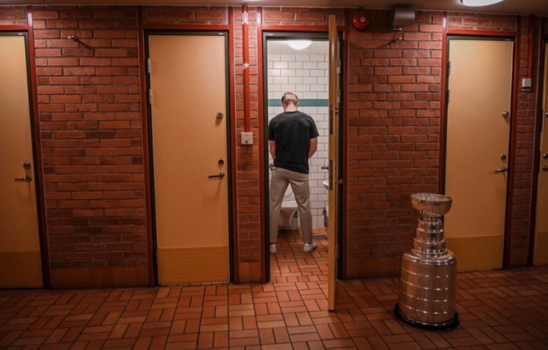 But credit to Gabriel Landeskog. He's a gentleman and allowed the Cup to wait outside of the bathroom while he ripped a piss.
