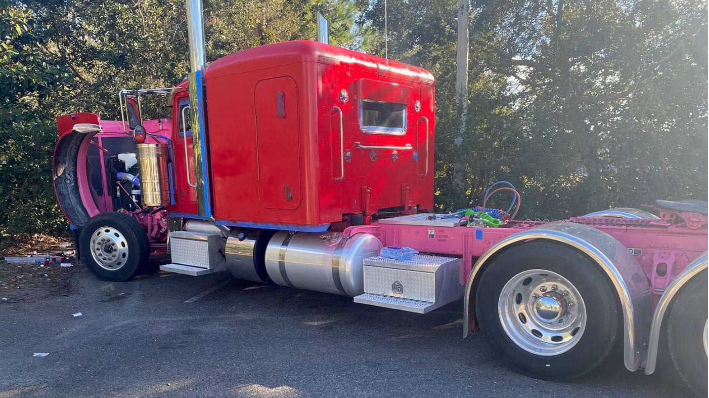 The recovered semi-tractor is valued at $280,000. The semi-tractor’s original color is pink (really). The pair were in the process of spray painting the stolen semi-tractor red to conceal its original color when deputies arrived. Makes sense. I’m actually impressed with how good their paint job was coming along. They even took the time to tape it off. The semi-tractor’s GPS had been disabled and removed but was found nearby in the woods.