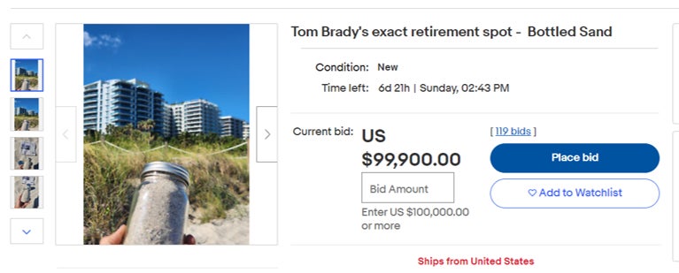 Tom Brady's exact retirement spot sand is for sale on eBay. Unless I'm reading this wrong, this means somebody has already bid $99,900 for the sand, correct?