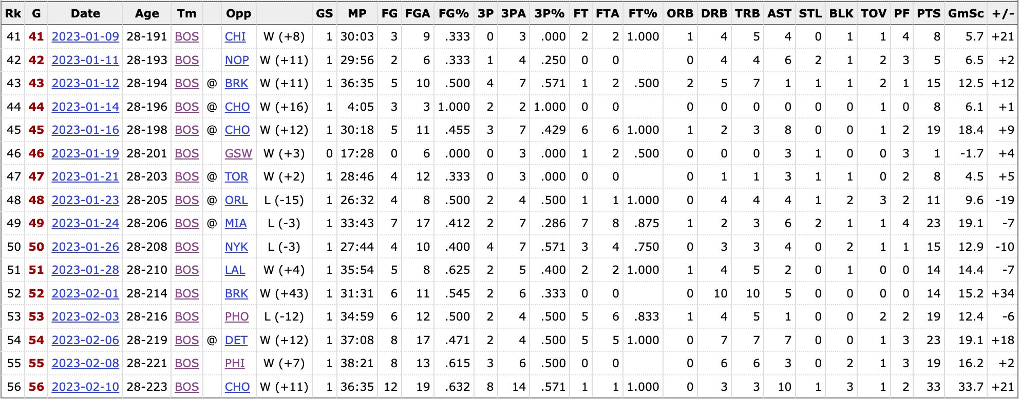 They had a choice to make. Either respond and reassert yourself or let things snowball. With teams on their heels for the #1 seed, it was clear what path they had to choose. Since that January 26th loss, the Celts have now won 5 of their last 6. They're the first team to 40 wins and the only team that has won 40 before they've lost 20, and if you pay attention to NBA history you know why that's a big deal. Heading into this stretch of 7 of 8 games being at home, I think most people were hoping for no worse than 5-2. If the Celts take care of their shit tomorrow against the Grizzlies, they'll get that 5-2.