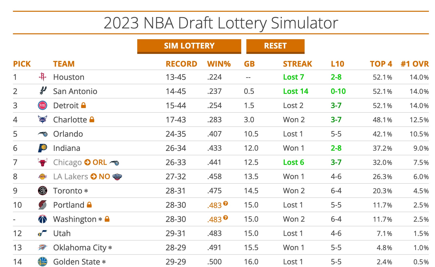 and the usual tanking suspects have started to get their ducks in a row in the hopes of bringing him into their franchise later this summer. The Rockets have lost 7 straight to fall to 13-45 heading into the break, the Pistons dropped their last 2 to drop to 15-44, and the Spurs, shoutout to the Spurs for taking no chances in the tanking sweepstakes as they've lost 14 straight to fall to 14-45. As you can imagine, those three are leading the Wemby charge