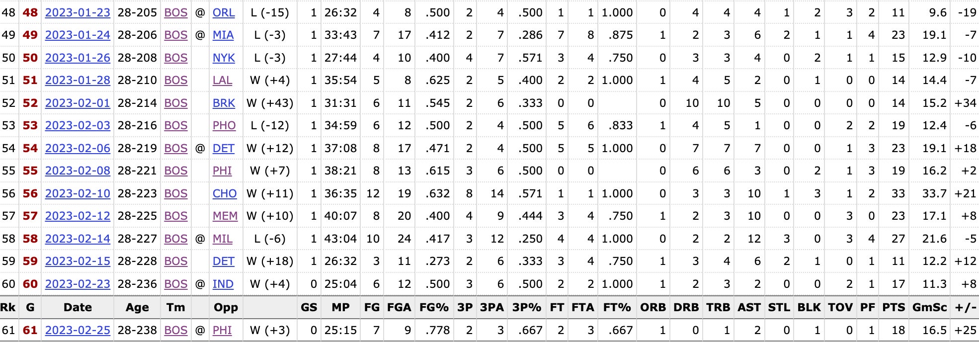 The more important aspect of last night is it kept the Celts on pace with MIL. We all wanted a strong start out of the break, and so far it's hard to be better than 2-0. Tomorrow night brings a Knicks team that's playing really well at the moment, and we know how those games can be (see last month). Meanwhile the Celts have won 9 of their last 11 and can play even better.