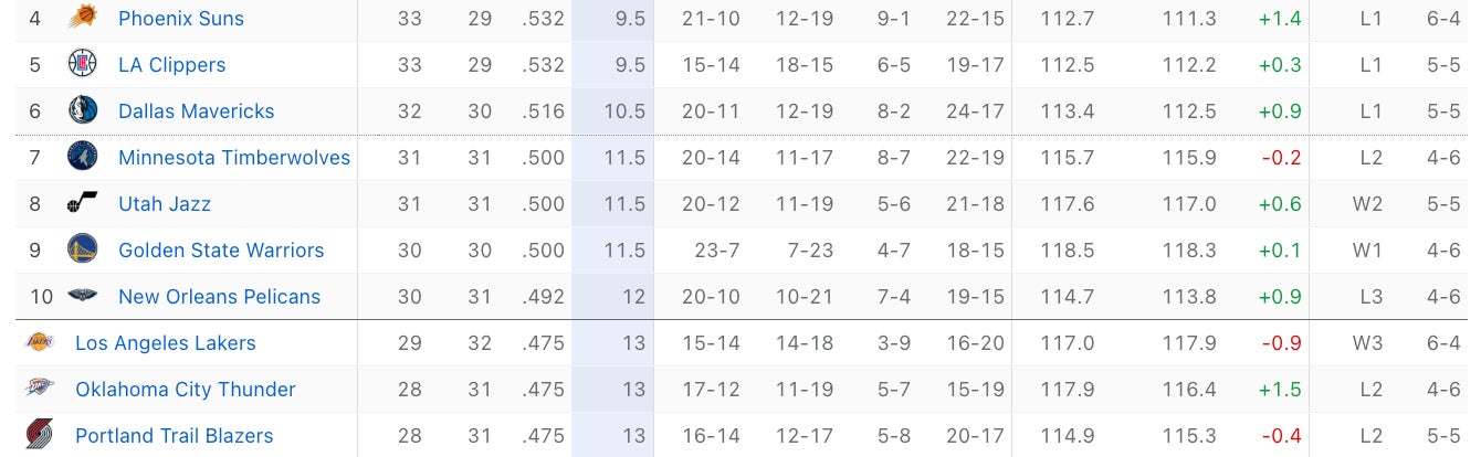 Then you've got the Suns and Clippers, who have choked multiple times in recent years. We saw what happened to the Mavs in Sunday's collapse. No one can trust the Timberwolves with Karl-Anthony Towns still out, and even with him in the lineup? Meh. Utah is blowing everyone's minds by being anywhere near the play-in conversation. The Warriors don't have Steph, and the Pelicans don't have Zion.