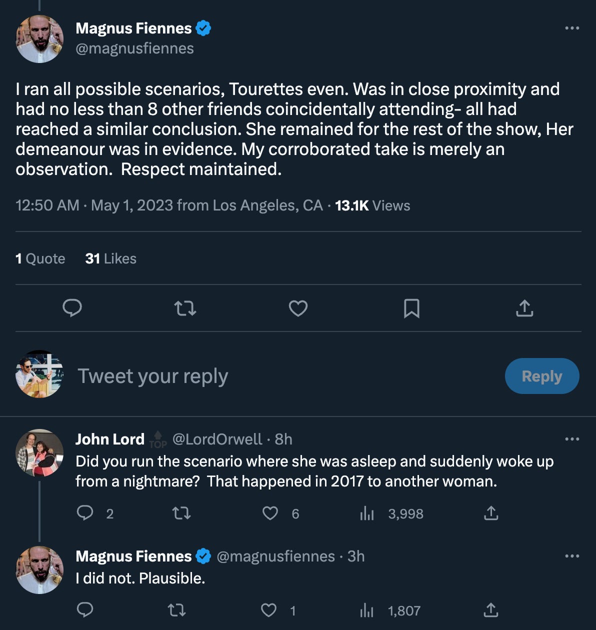 Of course there's no way to know for sure without hearing directly from the woman in question. I wasn't there. Unclear whether or not that would make any difference but. We don't have to take one witness's word or one audio clip's word for it — we haven't yet heard from the most rock solid and thorough source yet: Magnus Fiennes.