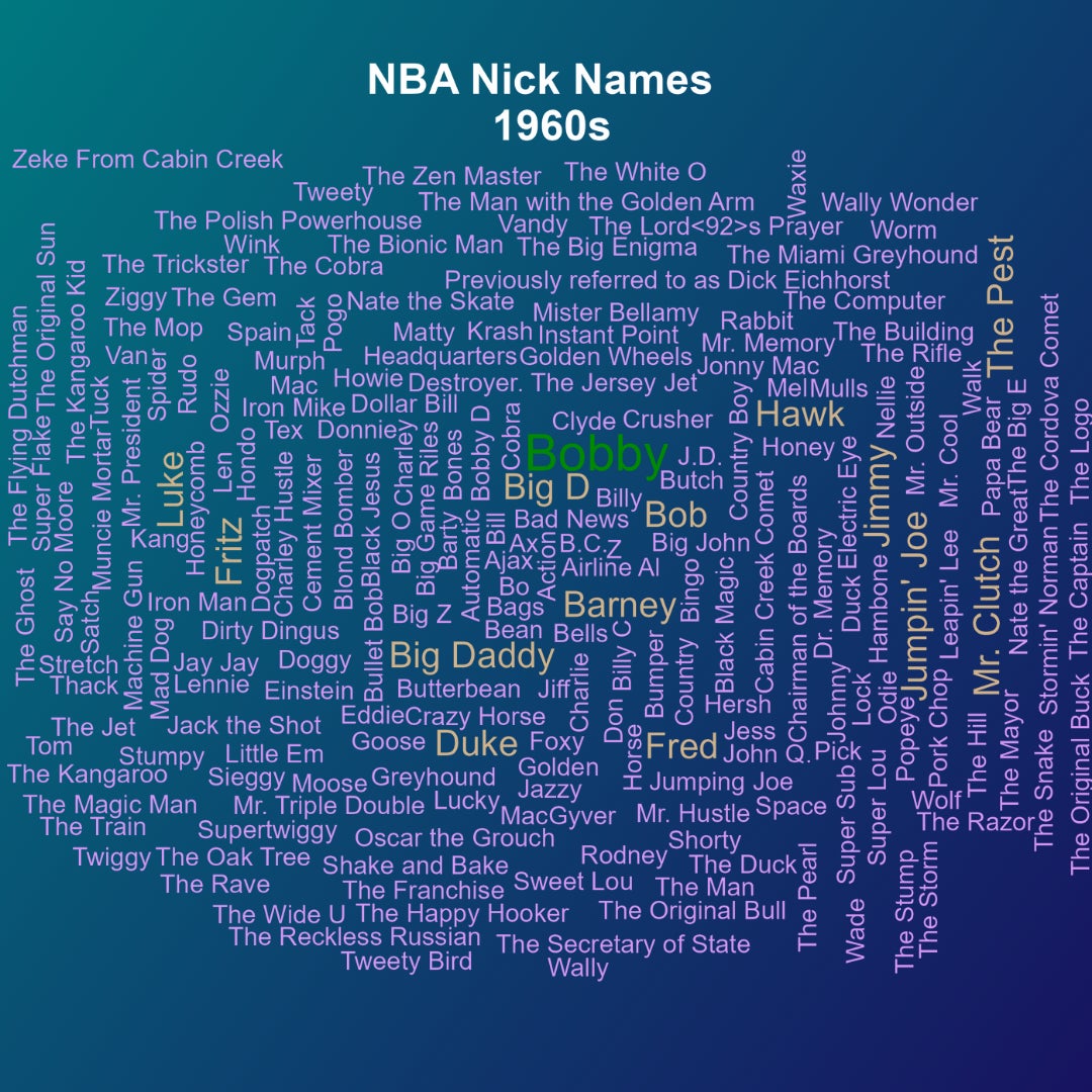 Welcome to Part 2 of NBA player nicknames from the decades. Today we cover the groovy 60s. Big thanks to the nickname curators at Basketball-Reference who filed nicknames for over 1,900 players in NBA history. I tip my cap to their dedication. Just like Part 1, we have a word cloud with all eligible players. This time it's anyone who began their NBA career in the 1960's. "Bobby" ended up being the most popular with four total players including three Bobs and one Not Bob.