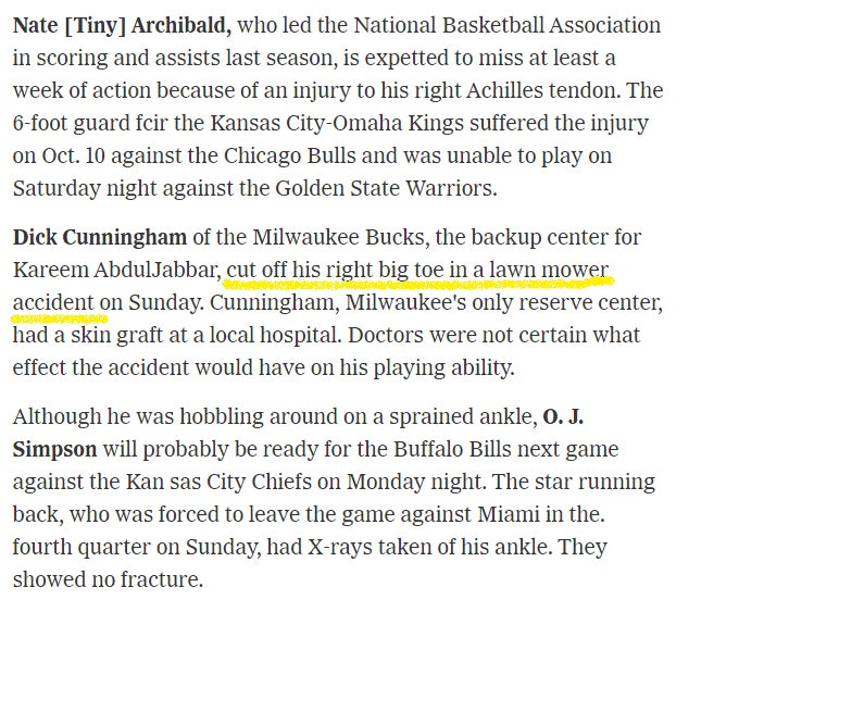 What a burying of the lede masterpiece by the NYT. The guy expected to miss a week get's the first spot over "cut my toe off with a lawn mower" guy. What is it with NBA players getting hurt doing yard work? I'm just going to assume this guy is related to Jaylen Brown.