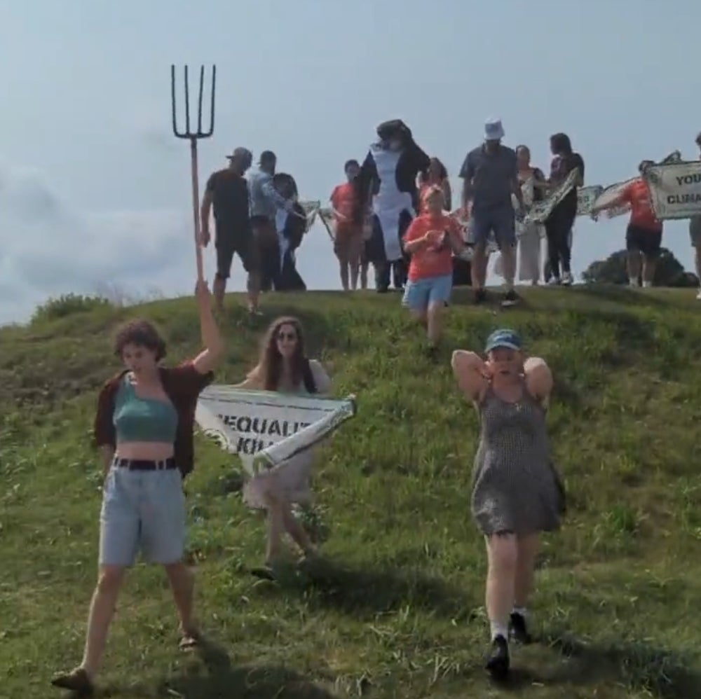 No. It's a group of wealth gap/climate/Native American land protestors shaking pitchforks in cow costumes, cosplaying both sides of the livestock-slaughterer spectrum, off the pristine 18th green. And this is their January 6th.