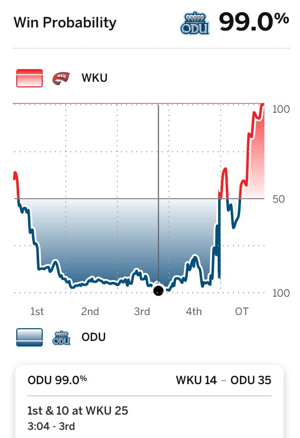 Holy hell, Old Dominion. You're all familiar with 28-3, but the Monarchs authored the rare 28-0 collapse today in the Famous Toastery Bowl. ODU had a 99 percent chance to win as late as with just 3:00 left in the third quarter.