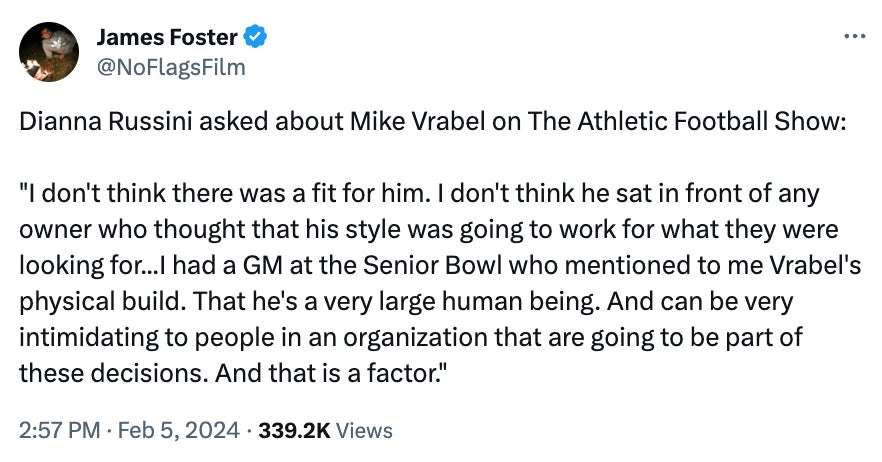 I think Mike Vrabel has a discrimination case on his hands if he so pleases. The NFL prides itself in its non-discriminatory hiring process, but look at what teams are doing, black balling a coach because he spends too much time lifting weights. Oh sorry he's not studying the GTO analytic charts with Nerdy McNerdyboy down in Miami. If using our balls to make decisions is wrong, lock us up. And that's exactly what NFL front offices are doing to him, and to me by extent. I was wondering why I didn't get a look in any of the open jobs so far, and now I know. The NFL will be hearing from our lawyers.