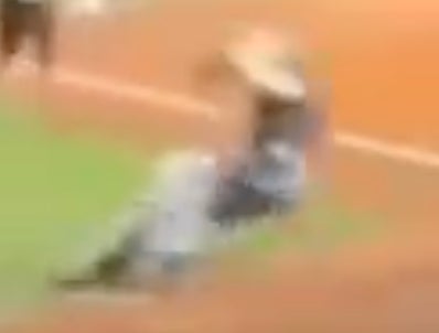 Impeccably clear photo, I know. But the way he barely stays on his feet until he damn near goes perpendicular with the ground impressive. And I saw someone say that if the other team had half a brain, they'd wait until the dust settles and then appeal that the runner missed first base, giving the umpire the opportunity for the ultimate payback. I like that idea….all is fair between the 1st and 3rd base lines.