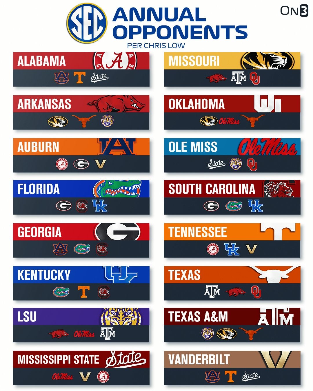 So much for that Tuesday night TV special. We have the first batch of SEC annual opponents 36 hours early thanks to Chris Low. As a reminder, these can change after four years but from 2026-29, these are the opponents each SEC team will play every year with the other 12 rotating every other year.