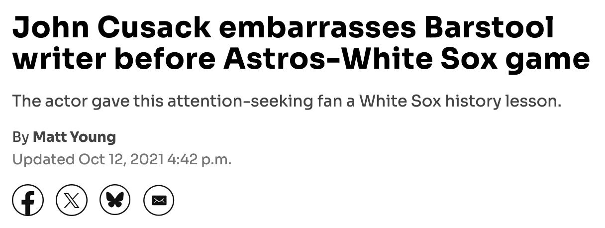 I have half a mind to think that some of these celebrities don't actually care about our sports teams as much as we do. It's almost like they'll cheer for whoever is convenient for them to cheer for at the time. Who could forget when John Cusak thought he could flip from the Cubs to the White Sox all willy-nilly without feeling the wrath of the Chicago White Sox #1 fan enforcer.