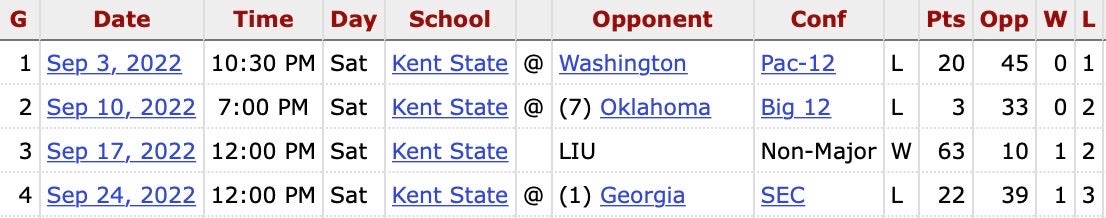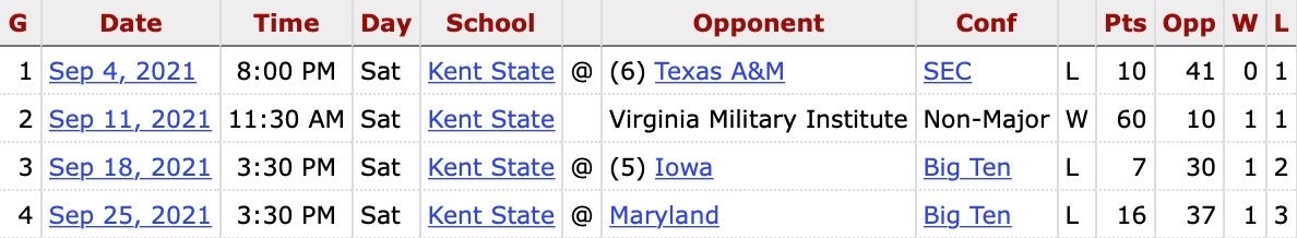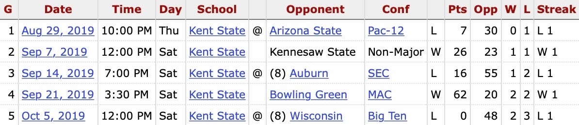 Unless you're the Kent State Golden Flashes. The Kent State Golden Flashes have been willingly throwing themselves to the wolves for years on end. Part of it is bad luck. But not really. Obviously, these games are scheduled years in advance. They can't know for sure how formidable their opponent will be in the future. But they can have an idea. There's a difference between scheduling Georgia and Vanderbilt. Or Penn State and Rutgers. The way Kent State schedules …. Flashes fans can pretty much pencil themselves in for 2 top ten beat downs every god damn season.
