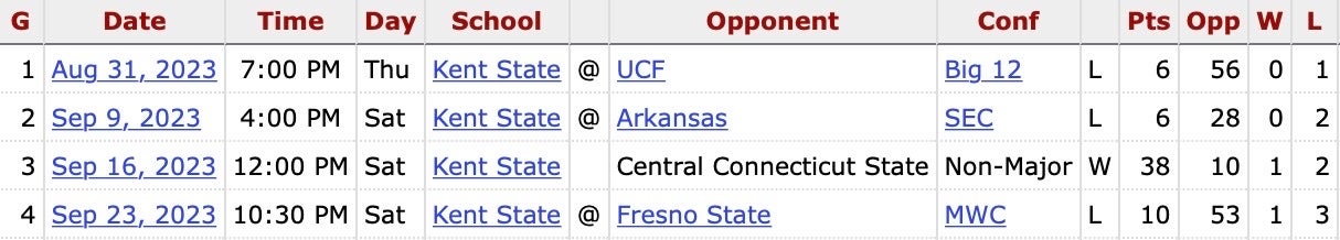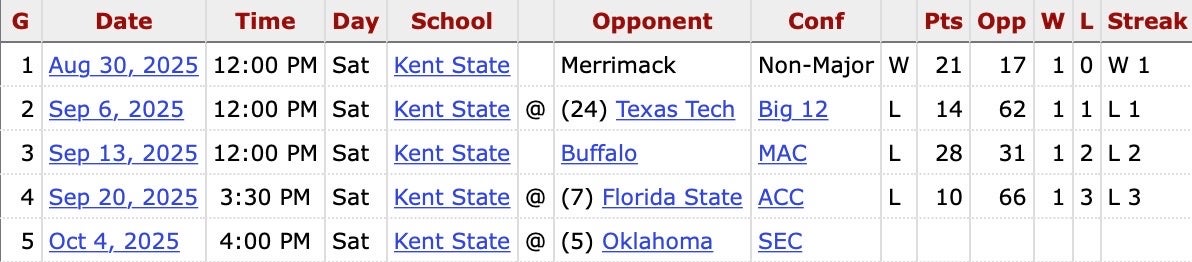 Very kind of Kent State's schedule makers to throw Merrimack in there. But aside for that, their non-conference schedule feature three teams who going into Week 6 are in the AP Top 11. That's diabolical. Kent State isn't just your regular mid-tier MAC program either. Kent State is year after year a bottom 10… if not bottom 5… if not bottom 1 team in D1 college football. Kent State's administration sending their football team to collect checks at Texas Tech, Florida State, and Oklahoma all in one year is downright cruel. And 2025 isn't an outlier. It's probably the toughest schedule they've had yet. But for the last 5 years (with a rare exception in 2023) Kent State has been borderline masochistic in the way they've scheduled. Aside from that exception in 2023, it's been 3 power conference matchups for Kent State no matter what. Not the fledgling power conference schools either. The good ones. 5 out of the last 6 years, Kent State has played at least two non-conference opponents while they were in the top 10.