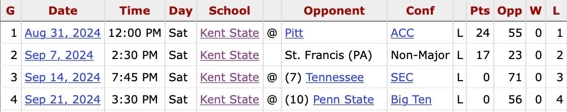 Now to be fair to Kent State's schedule makers, Kent State could schedule three games vs the Sun Belt and still probably get blown out. So if you're going to get your ass kicked regardless, you might as well get paid for it. To be even more fair, Kent State closed their fiscal year in 2024 with a $9.9M deficit. So maybe this is their way of digging themselves out of that hole. Maybe this is their only option if they want to keep funding a football program at all.