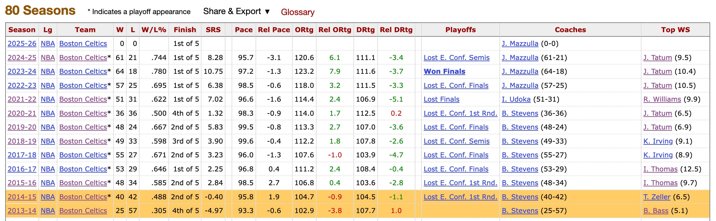 That team finished the season 20-9, made the playoffs (got bounced early) and the entire rebuild was suddenly sped up. From that moment on, the Celts solidified themselves as "contenders". As you can see in the graphic above, outside of the shortened Covid year, they never won fewer than 48 games. They made 6 Conference Finals, 2 NBA Finals, and won 1 championship. It was clear that what they did in that 2014-15 season set the table for their entire future.