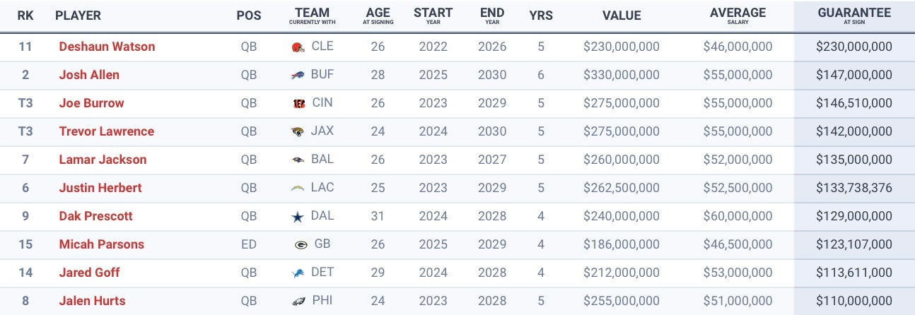 Jesus Christ, Browns. The worst QB situation in the NFL, and they're paying more money to one than anybody else. Sometimes I forget just how all-time terrible that contract is. Someday, someone will knock Deshaun Watson off the top of that list. Might not be for another few years or so, but it's bound to happen eventually.