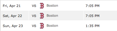 Friday, April 21 vs Boston- Dylan Bundy (2-1 1.86) vs Drew Pomeranz (1-0 5.23)