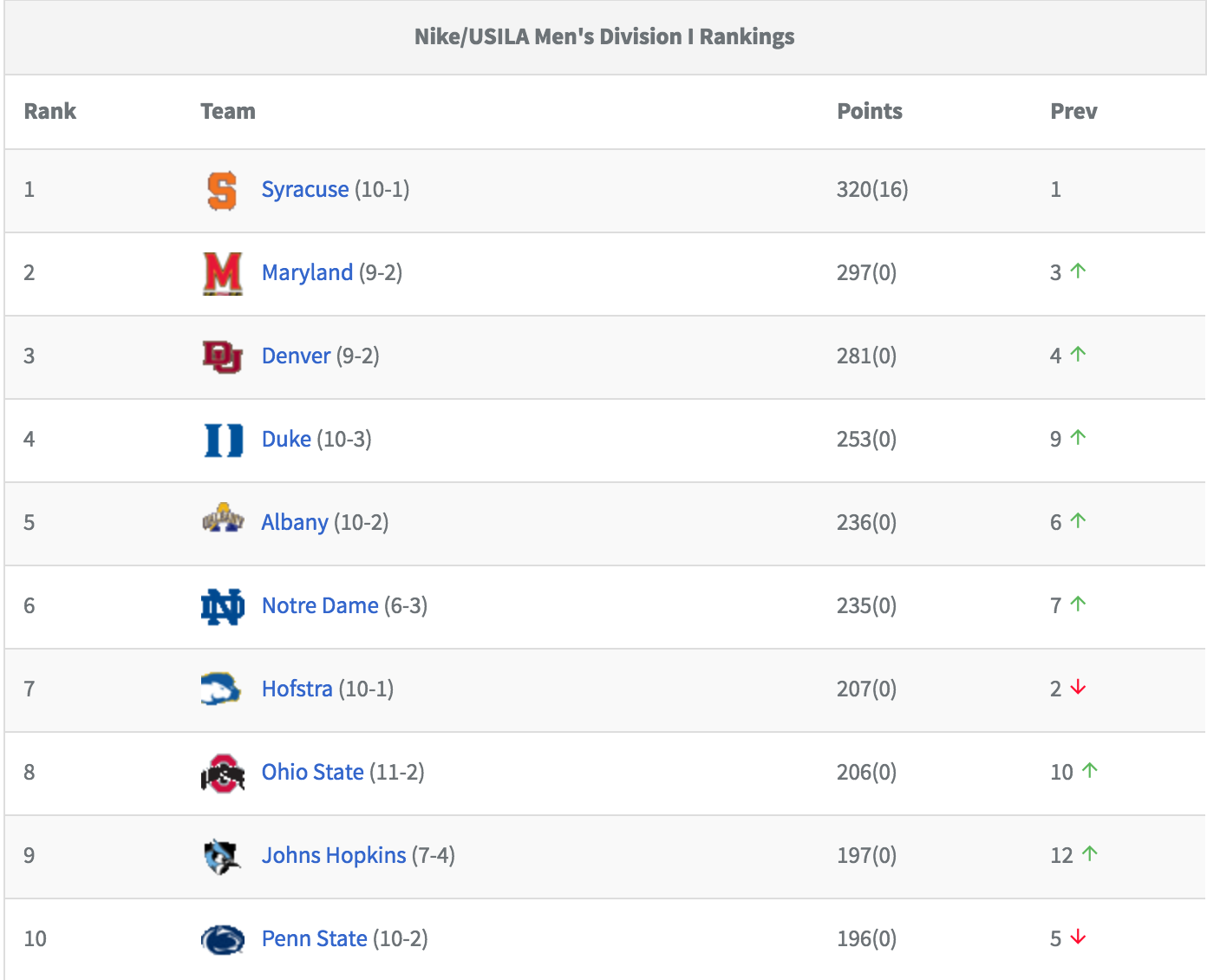 Duke looks like they can start looking for hotels to stay at in Boston for Memorial Day Weekend with their only loss in the last 2 months coming against Cuse in overtime. So yeah. The usual suspects are starting to assert their dominance and here’s how the rankings look heading into weekend.