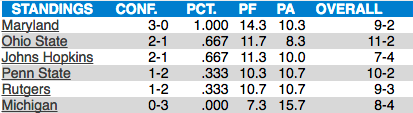 Rutgers clearly gave Maryland everything they had last week taking them to 3 overtimes. Dan Morris had at least 4 or 5 big dick saves for the Terps to hold on to that one and leave New Brunswick with a win. So now they head to Penn State. Both teams are 1-2 in the B1G. Both teams have dropped to Hopkins and Maryland. And here’s how the standings in that conference look right now.