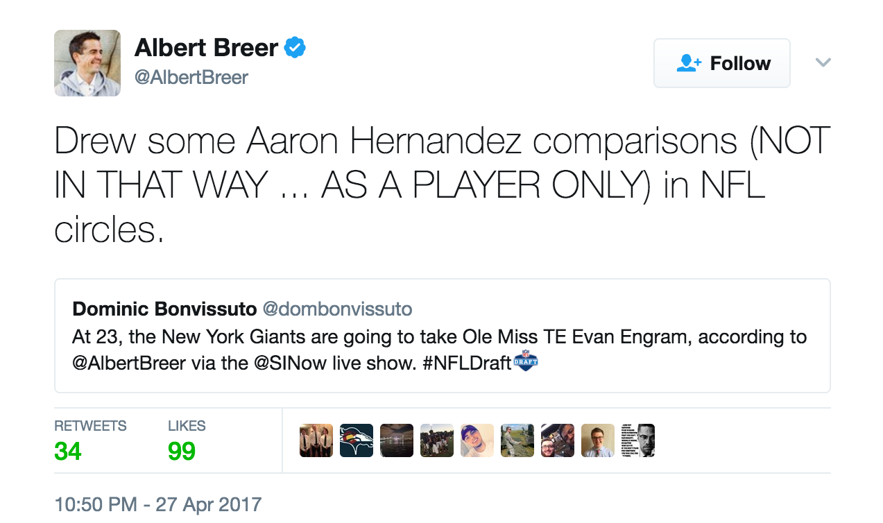 Well there it is. I honestly had no preference or feel for what the Giants would do with this pick. The one thing I want them to do is replace Ereck Flowers with a starting left tackle, but that didn’t look to be an option based on the players available in the draft. In all honesty, I am looking more forward to the potential cuts of a left tackle in the preseason than I am for the draft. So I was cool with an offensive lineman, a tight end, or a linebacker. But I did NOT see Evan Engram getting picked. I was rooting for OJ Howard to fall to us just so the option was there, but I figured once the Bucs punched his ticket to Jameis Winston Tampa Florida, the Giants would pick Njoku if they went tight end. According to the mock drafts this was a reach. But so was the Eli Apple pick last year and I guess it’s worked out so far. Right?
