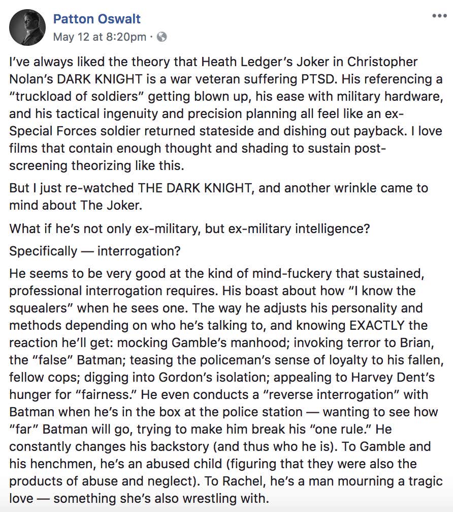 In this blog, we’re taking a look at a theory Patton Oswalt shared on his Facebook page yesterday about what The Joker’s backstory may be in ‘The Dark Knight’. It’s obviously a huuuuuuge block of text, so if you want the tl;dr version, here ya go…