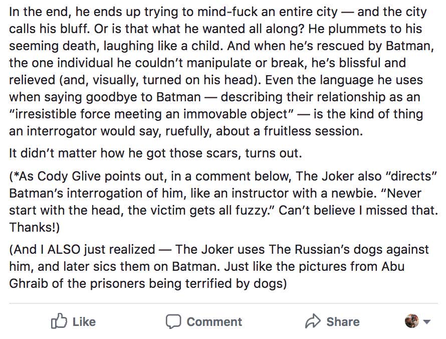 “In the end, he ends up trying to mind-fuck an entire city — and the city calls his bluff. Or is that what he wanted all along? He plummets to his seeming death, laughing like a child. And when he’s rescued by Batman, the one individual he couldn’t manipulate or break, he’s blissful and relieved (and, visually, turned on his head). Even the language he uses when saying goodbye to Batman — describing their relationship as an “irresistible force meeting an immovable object” — is the kind of thing an interrogator would say, ruefully, about a fruitless session.”